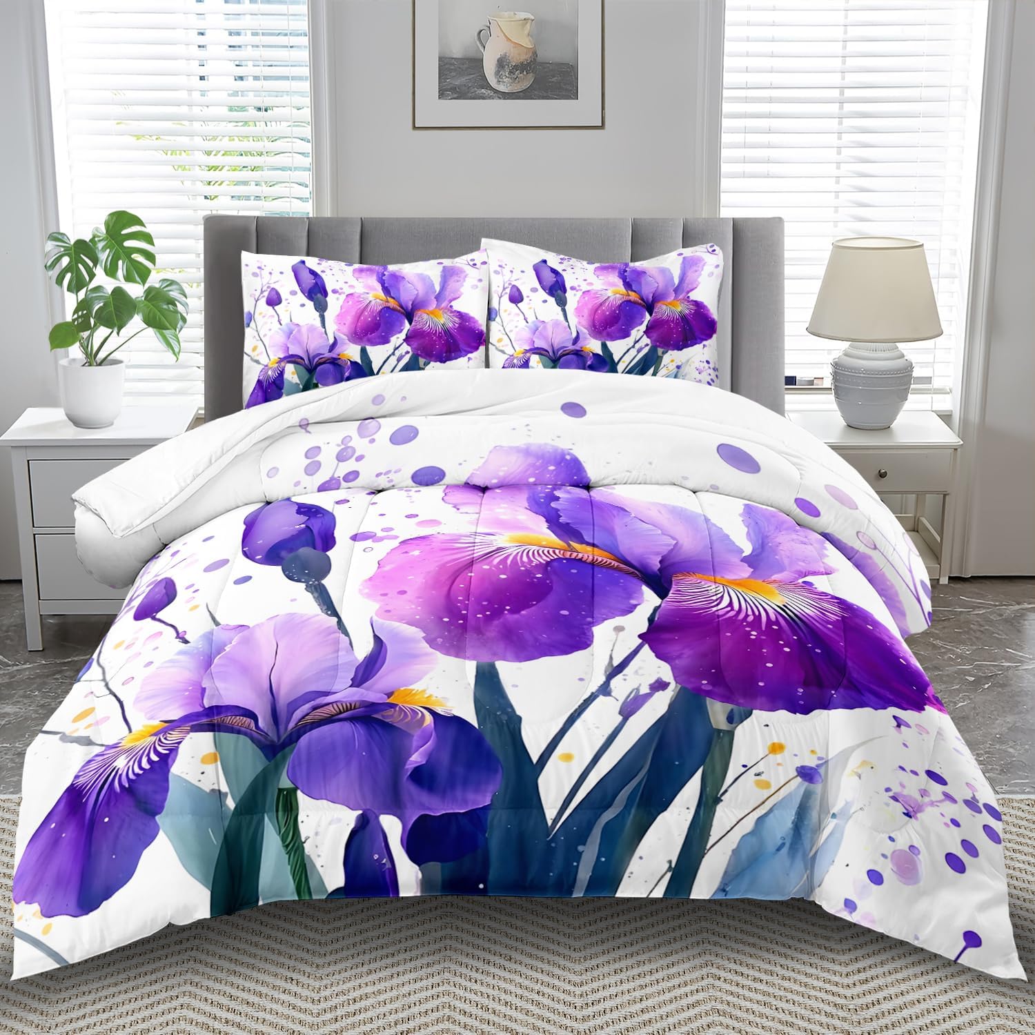- Twin Size Floral Iris Comforter Set :This bedding set includes 1 comforter(67" x 85") and 2 pillowcases(20”x30”). In order to facilitate transportation, the quilt is made of vacuum compression technology. It will be slightly wrinkled when taken apart, but it will quickly regain its fluffiness if you gently beat it.