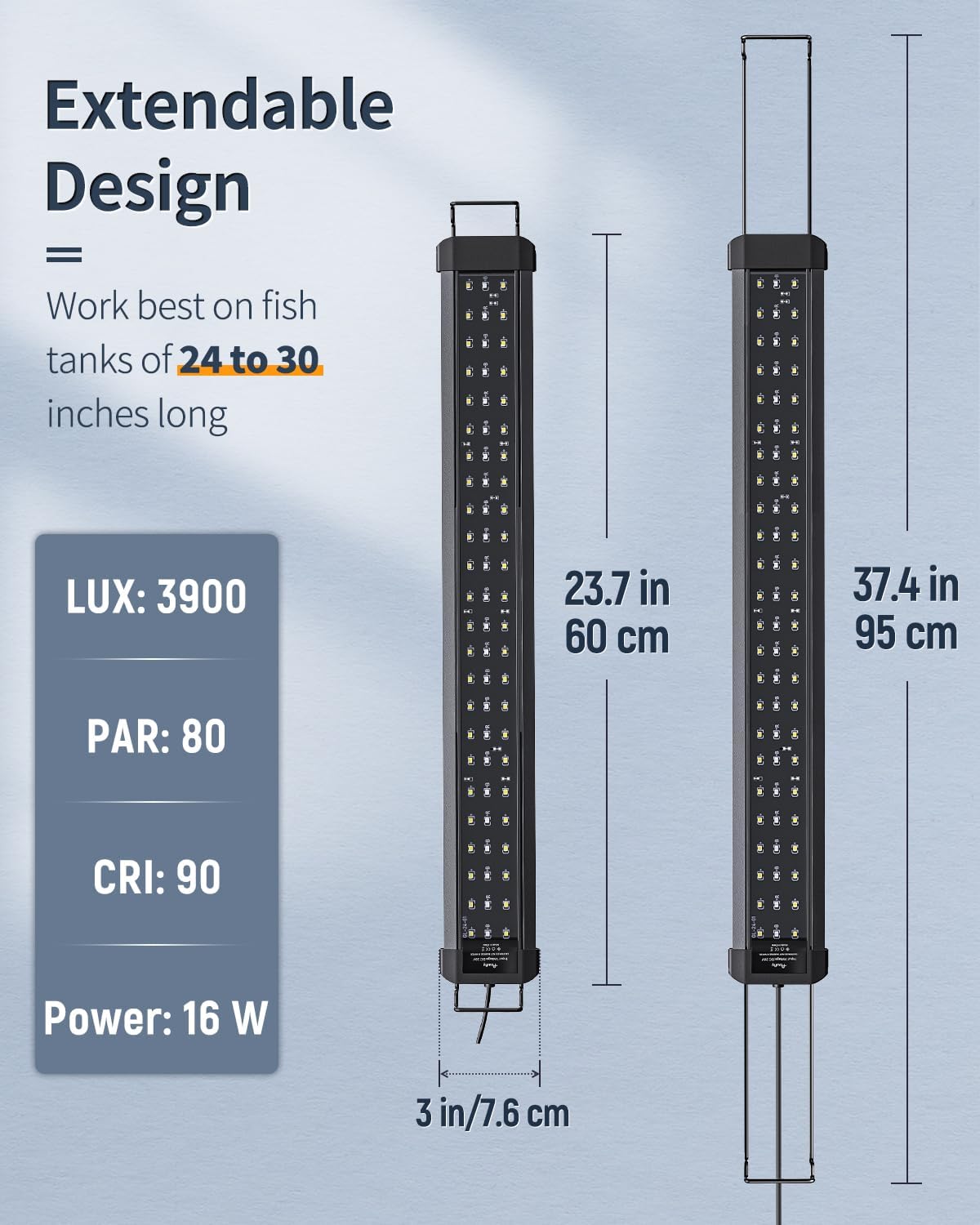 - For 24" to 30" Tanks: With an extendable bracket (min length: up to 24"; max length: up to 38"), the LED aquarium light always stays steady on the fish tank. Work best on tanks of 24 to 30 inches long.