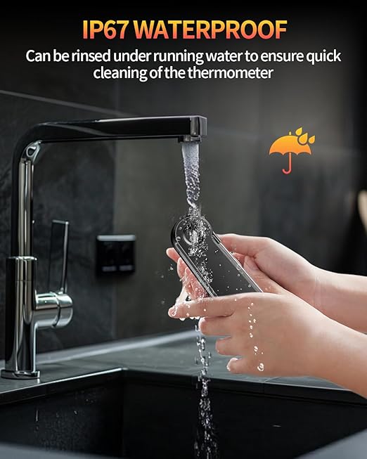 - IP67 WATERPROOF AND MORE DURABLE: The meat thermometer is IP67 waterproof rated and can be rinsed under a faucet after use without causing any damage. Easy to clean and durable, which means you can safely wash the entire body under tap water (no immersion). The body is made of sturdy ABS plastic with excellent drop resistance, which means this digital kitchen thermometer can withstand accidental drops or other impact accidents for a longer life