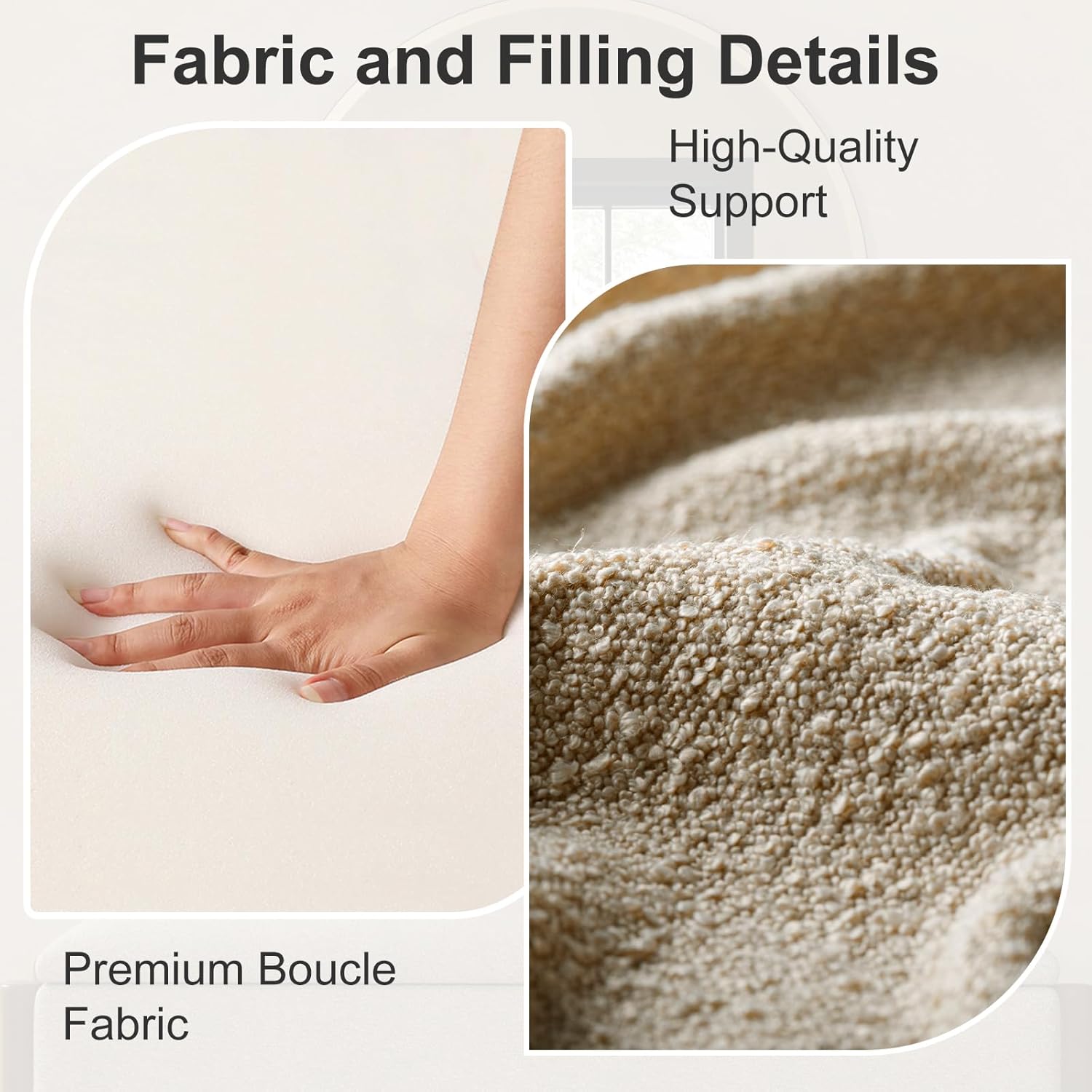 - Soft Boucle Fabric and High-Density Padding: Ottoman with storage features luxurious boucle upholstery for a soft, comfortable seat. This storage ottoman's durable fabric and high-density foam padding offer excellent support. Whether used as seating, a footrest, or an accent piece, this storage bench ensures lasting comfort. For bedroom use, it guarantees elegance and comfort. Storage ottomans with such padding are reliable and stylish additions