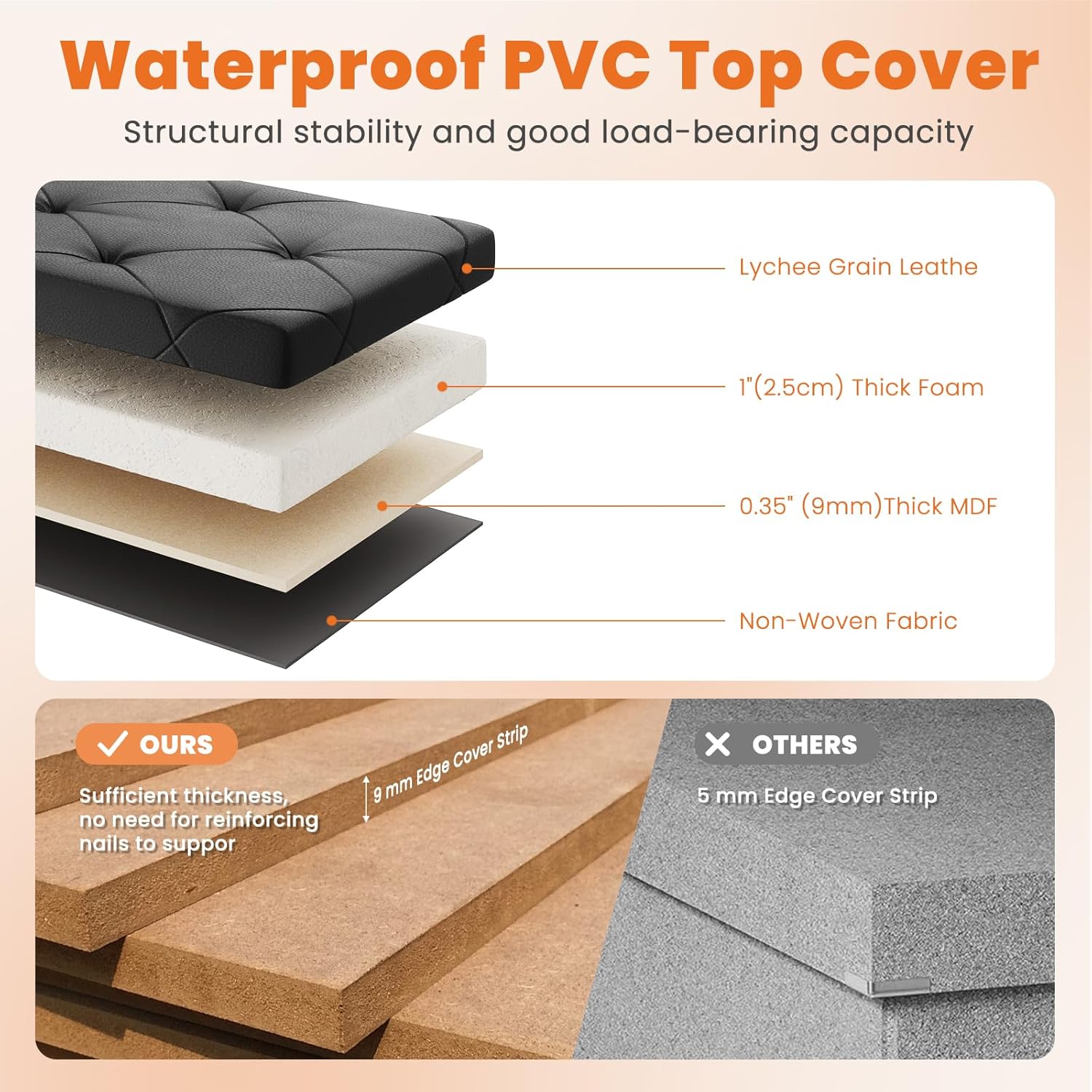 - 【Premium & Durable Build】The black Sweetcrispy storage ottoman features chic Lychee Grain Leather, while brown uses sleek Synthetic Leather—both super comfy and built to last. No flimsy stuff here! We use 4 layers of reinforced material with 9mm-thick edges, supporting up to 660 lbs without extra nails. Just sturdy Sweetcrispy quality!
