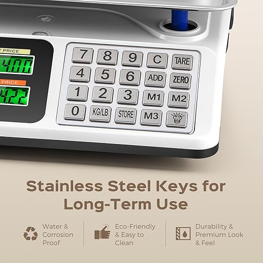 - 【Durable & Hygienic Stainless Steel Construction】Designed for demanding daily use, the scale features a full stainless steel platform and tactile stainless steel keys. This rust-resistant design is not only built to last but also ensures easy cleaning and maintenance, meeting strict food safety and hygiene standards for deli, meat, and produce handling.