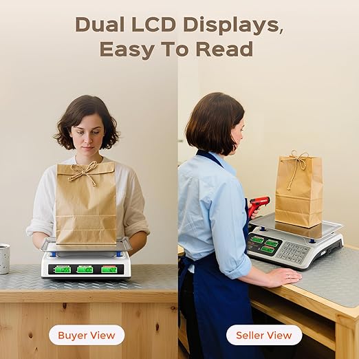 - 【Ultra-Clear Dual LCD Display with Bright Backlight】The large dual-screen design clearly shows weight/unit price on top and total price on the bottom. The vibrant green backlight ensures perfect visibility in low-light conditions, like farmers markets or dimly lit shops.