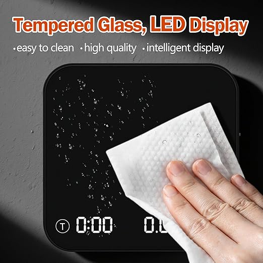 - LED Display Screen: The coffee scale with timer is made of a smooth glass platform and a hidden LED screen, which can be clearly read even in backlit or low-light environments, making it suitable for outdoor coffee lovers. The espresso scale also comes with a silicone pad to prevent water or heat, making coffee brewing safer.