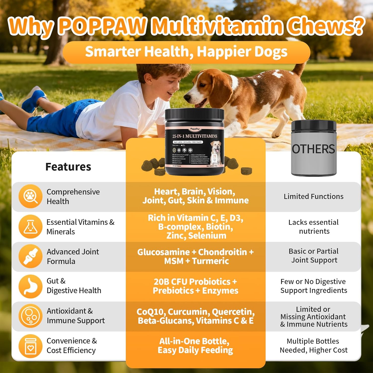 - 25-in-1 Daily Dog Multivitamin Chews: Comprehensive dog vitamins and supplements for skin & coat, joint health, heart, brain, digestion & immunity. Rich in Omega-3 fatty acids (DHA/EPA), vitamins, minerals & CoQ10 for daily vitality. Convenient, tasty soft chew for all breeds & life stages. Ideal daily multivitamin for dogs of all breeds and ages. Best results with continued daily use.