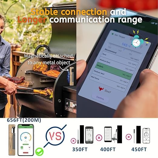 - Real-Time Monitoring & Long Range: Get precise temperature readings directly on your smartphone or base. Built in Bluetooth 5.3 with a 600ft Bluetooth range, you can monitor your cooking from anywhere in your home, giving you the freedom to move around without losing connection. The app is compatible with both iOS & Android devices, ensuring seamless monitoring at your fingertips.