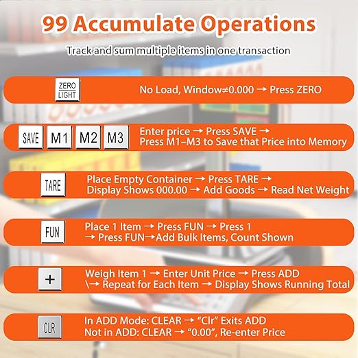 - One-touch Efficiency: The weight scale for food is equipped with intuitive controls, including a one-key lb/kg switch, parts-counting mode and 3 shortcut buttons that store frequently used unit prices for quick access. It also supports up to 99 cumulative transactions, streamlining fast-paced commercial use.