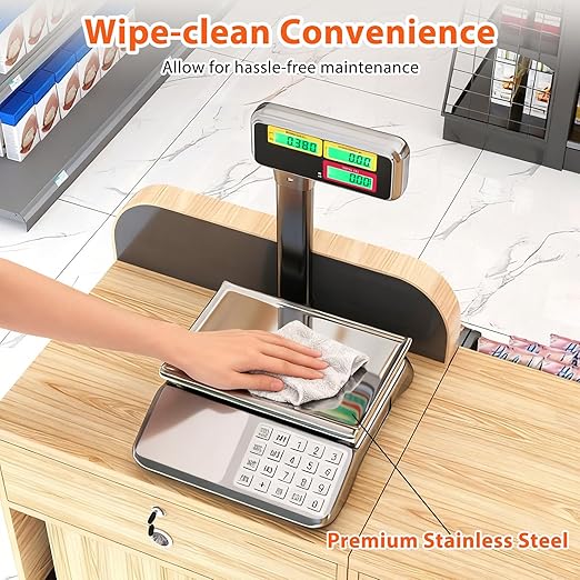 - Transparent Dual View: Featuring a pole-mounted dual LCD design, this commercial food scale allows both sellers and buyers to view weight, unit price and total simultaneously on front and back screens. The green backlight with 2 adjustable brightness levels enhances visibility in various lighting conditions.