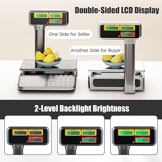 - Dual Display Convenience: Featuring a two-sided LCD screen, this price computing scale allows both seller and buyer to view weights and prices clearly. The adjustable backlight settings and the option to switch between pounds and kilograms adapt easily to different preferences and environments.