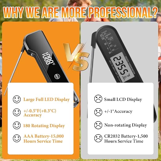 - Ultra-Fast and Highly Accurate: Our instant read thermometer features a temperature probe and advanced, highly accurate technology with 2-3 seconds response time,and the quality sensor as well as the stainless steel step-down tip, which is accurate to ±0.5° F (±0.3°C)with a wide range of -58℉-572℉(-50°C- 300°C) .